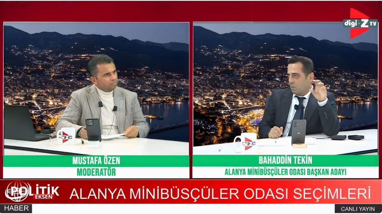 Alanya Minibüsçüler Odası’nda 17 Ocak 2026 tarihinde yapılacak başkanlık seçimleri öncesinde adaylar çalışmalarını sürdürürken, Başkan Adayı Bahaddin Tekin, Digi-ZTV’de Mustafa Özen’in hazırlayıp sunduğu “Politik Eksen” programına konuk olarak, birlik ve beraberlik vurgusu yaparken, esnafın uzun süredir çözüm bekleyen sorunlarına dikkat çekti.
