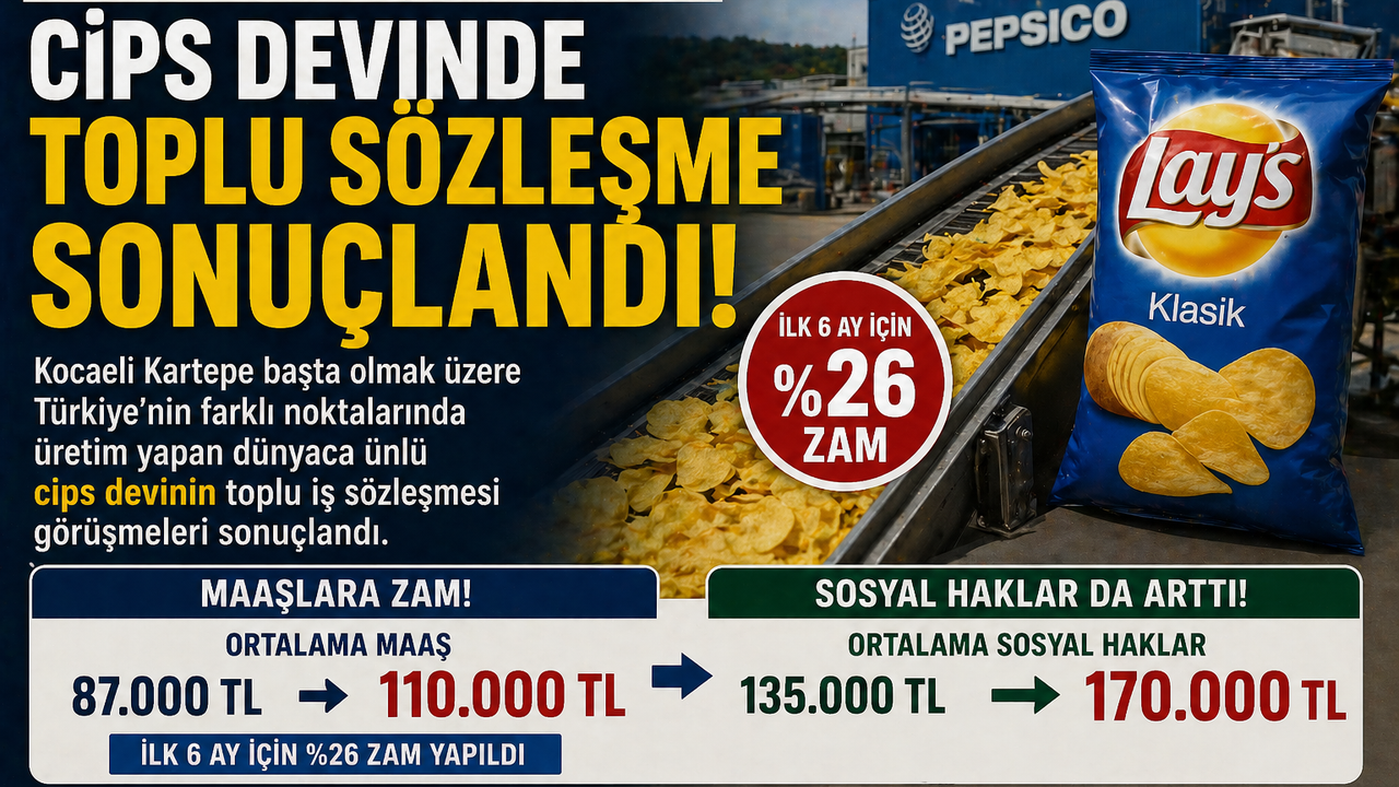 Türkiye’de gıda sanayisinin en dikkat çeken işçi sözleşmelerinden biri sonuçlandı. Uluslararası cips markasının Kocaeli Kartepe merkezli üretim tesisleri ile diğer fabrikalarında yürütülen toplu iş sözleşmesi görüşmelerinde çalışanların ücretlerine önemli artış sağlandı. Yapılan anlaşmaya göre işçilerin maaşlarına yılın ilk 6 aylık dönemi için yüzde 26 zam uygulanacak. Bu artışla birlikte ortalama çıplak maaşın 110 bin liraya yükseldiği öğrenildi.