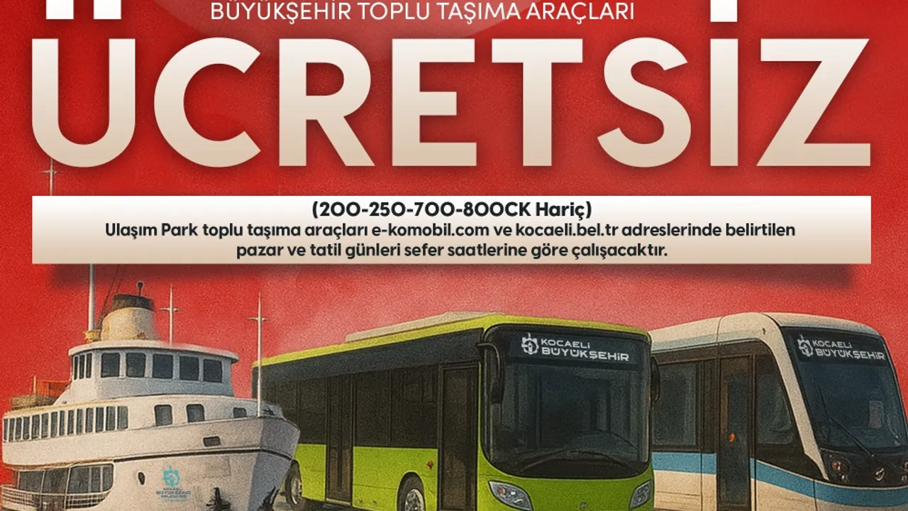 Kocaeli Büyükşehir Belediyesi, resmi ve dini bayramlarda uygulanan ücretsiz toplu ulaşım uygulamasına 30 Ağustos Zafer Bayramı’nda da devam edecek. Buna göre Büyükşehir’e ait otobüs, tramvay ve deniz ulaşımı araçları 30 Ağustos Cumartesi günü ücretsiz hizmet verecek.KOCAELİ (İGFA) - Kocaeli Büyükşehir Belediyesi’ne ait toplu taşıma araçları, vatandaşların 30 Ağustos Zafer Bayramı etkinliklerine daha kolay katılım sağlayabilmesi ve bayram coşkusunu birlikte yaşayabilmesi amacıyla gün boyu ücretsiz hizmet verecek.