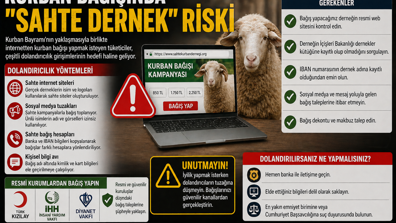 Bayram dönemlerinde artan yardım ve bağış hassasiyeti, dolandırıcıların da yeni yöntemler geliştirmesine neden oluyor. Son yıllarda özellikle internet üzerinden yapılan kurban bağışı kampanyalarında sahte dernek, vakıf ve yardım kuruluşu görünümlü oluşumların sayısında dikkat çekici artış yaşanıyor. Vatandaşların dini vecibelerini yerine getirme isteğini fırsata çevirmeye çalışan dolandırıcılar; profesyonel hazırlanmış internet siteleri, kopya banka hesapları, sahte vergi numaraları ve sosyal medya reklamlarıyla güven oluşturarak bağış toplamaya çalışıyor.