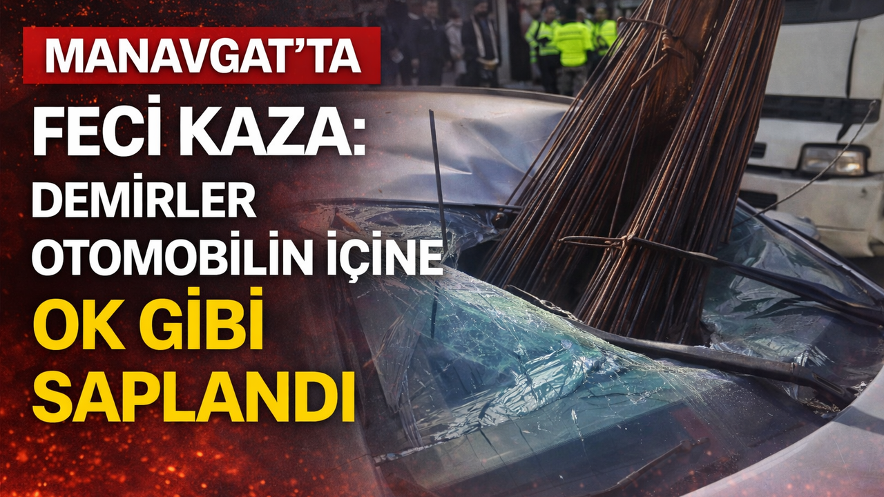 Antalya’nın Manavgat ilçesinde çekici üzerindeki inşaat demirlerinin bir otomobilin ön camından içeri girmesi sonucu meydana gelen kazada 2 kişi hafif yaralandı. O anlar güvenlik kamerasına saniye saniye yansıdı. Kaza, Demokrasi Bulvarı Mithatpaşa kavşağında sabah saatlerinde meydana geldi. Edinilen bilgiye göre, Erkan Y. yönetimindeki 07 GP 740 plakalı kamyon, kavşağa geldiği sırada fren yapınca üzerindeki inşaat demirleri öne doğru kaydı. Bu sırada demirler, Kader S. D.’nin kullandığı 34 GMU 039 plakalı otomobilin ön camından içeri girdi.
