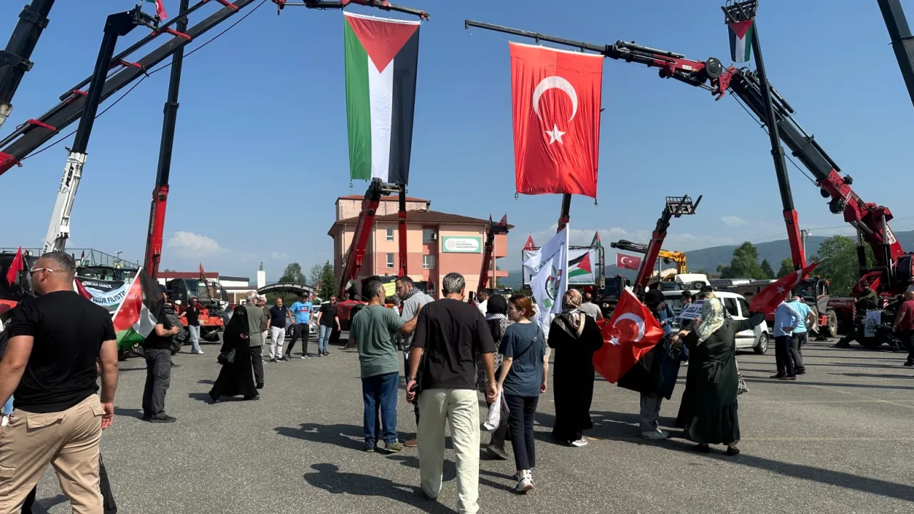 DÜZCE (İGFA) - Vinç firmaları ve bazı sivil toplum örgütlerinin desteğiyle yapılan konvoyda, Türk ve Filistin bayraklarıyla donatılmış çok sayıda vinç, çekici ve otomobil yer aldı.